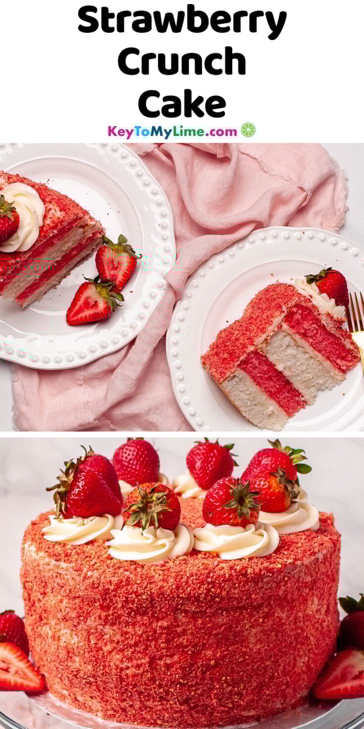 This strawberry crunch cake is made with layers of strawberry cake, white cake, homemade buttercream, and strawberry shortcake crumble.